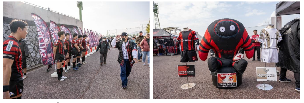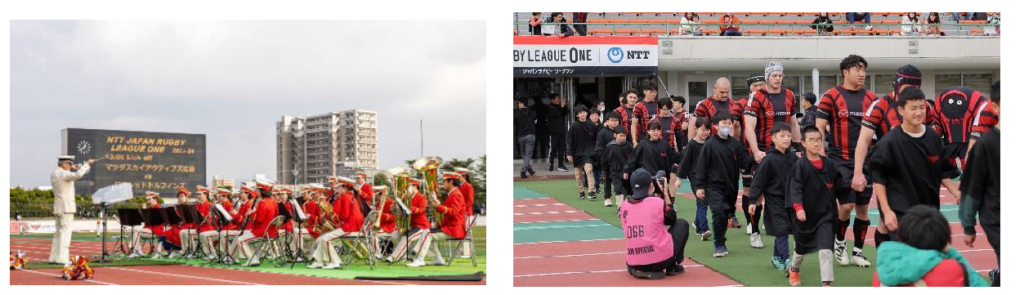 開幕戦を勝利したSA広島と、昨シーズンディビジョン2に所属し今シーズン2戦2勝と自力の強さをみせる日野RDとの一戦。『D3優勝=D2昇格』に向けて大事な戦いであることを胸に秘め、皆さんと共に挑んだホストゲーム第2戦、試合当日は天候に恵まれSA広島ホストゲームの最多来場者となる2,276人(公式記録)ものファンにお越しくださいました。地域の方との共創企画オープニングイベントでは、数多くのコンサートやパレード、式典(フラワーフェスティバル、広島市消防出初式など)に出演し、「市民に親しまれ、愛される音楽隊」広島市消防音楽隊様による素敵な音楽演奏で、KOまでの時間を楽しませてくださいました。